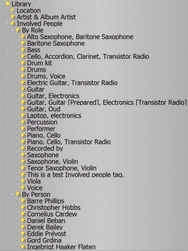 The Involved People Node add-on adds an Involved People node to MediaMonkey's tree, based on the contents of the Involved People field. The Involved People field must be in format "Role1: Name1; Role2: Name2" OR "Role1:Name1;Role2:Name2".